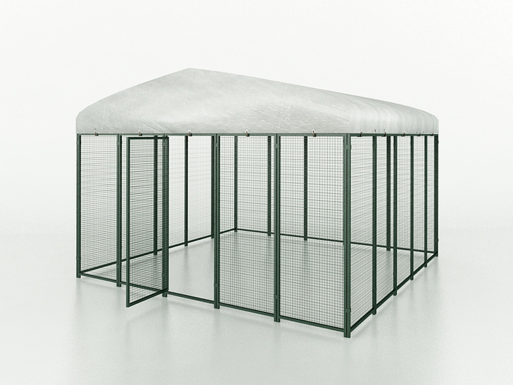 Hergestellt aus Kohlenstoffstahl mit einer antioxidativen Pulverbeschichtung. Die Struktur besteht aus 20 x 20 cm Rohren mit einer Dicke von 0,8 mm. Das Maschennetz ist 25 x 25 mm groß und hat eine Stärke von 1,8 mm. Mit einem Dach aus hochwertigem Polyethylen (PE), das wasserabweisend und UV-beständig ist. Die Farbe ist grün (RAL 6005).