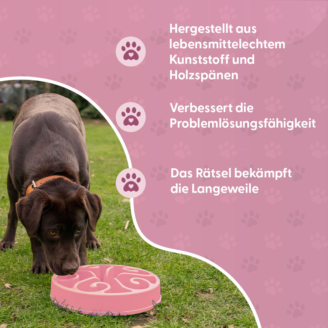 VerwendungVerwenden Sie den Anti-Schlingnapf für die tägliche(n) Portion(en) an Trockenfutter. Verteilen Sie das Trockenfutter gleichmäßig auf dem Futternapf. Dieser Futternapf kann auch für Snacks verwendet werden, so dass der Hund oder die Katze sich anstrengen muss, um das Leckerli zu bekommen.