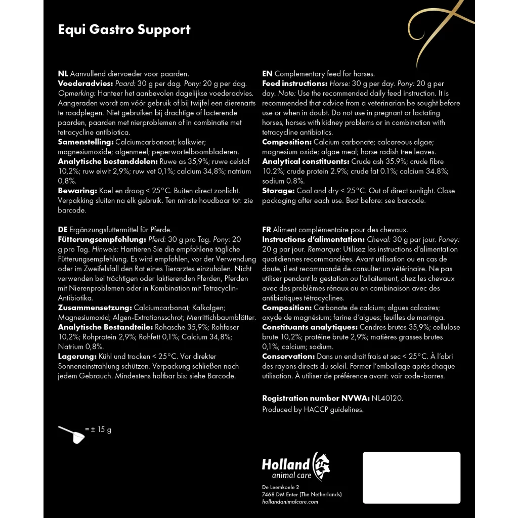 Equi Gastro Support hat eine einzigartige Zusammensetzung mit speziellen Inhaltststoffen. Kalkhaltige Algen unterstützen und erhalten einen normalen Magensäuregrad und neutralisieren übermäßige Magensäurebildung. Calciumcarbonat zum Neutralisieren des Mageninhalts und um den Magen zu beruhigen.