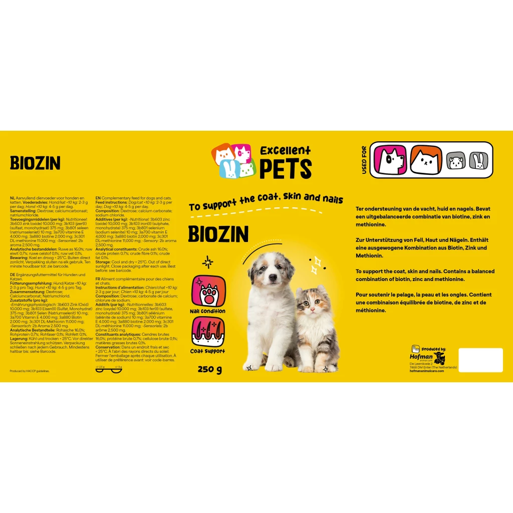 Excellent Pets Biozin ist ein Ergänzungsfuttermittel für Hunde und Katzen in Pulverform. Es unterstützt das Fell, die Haut und die Nägel.