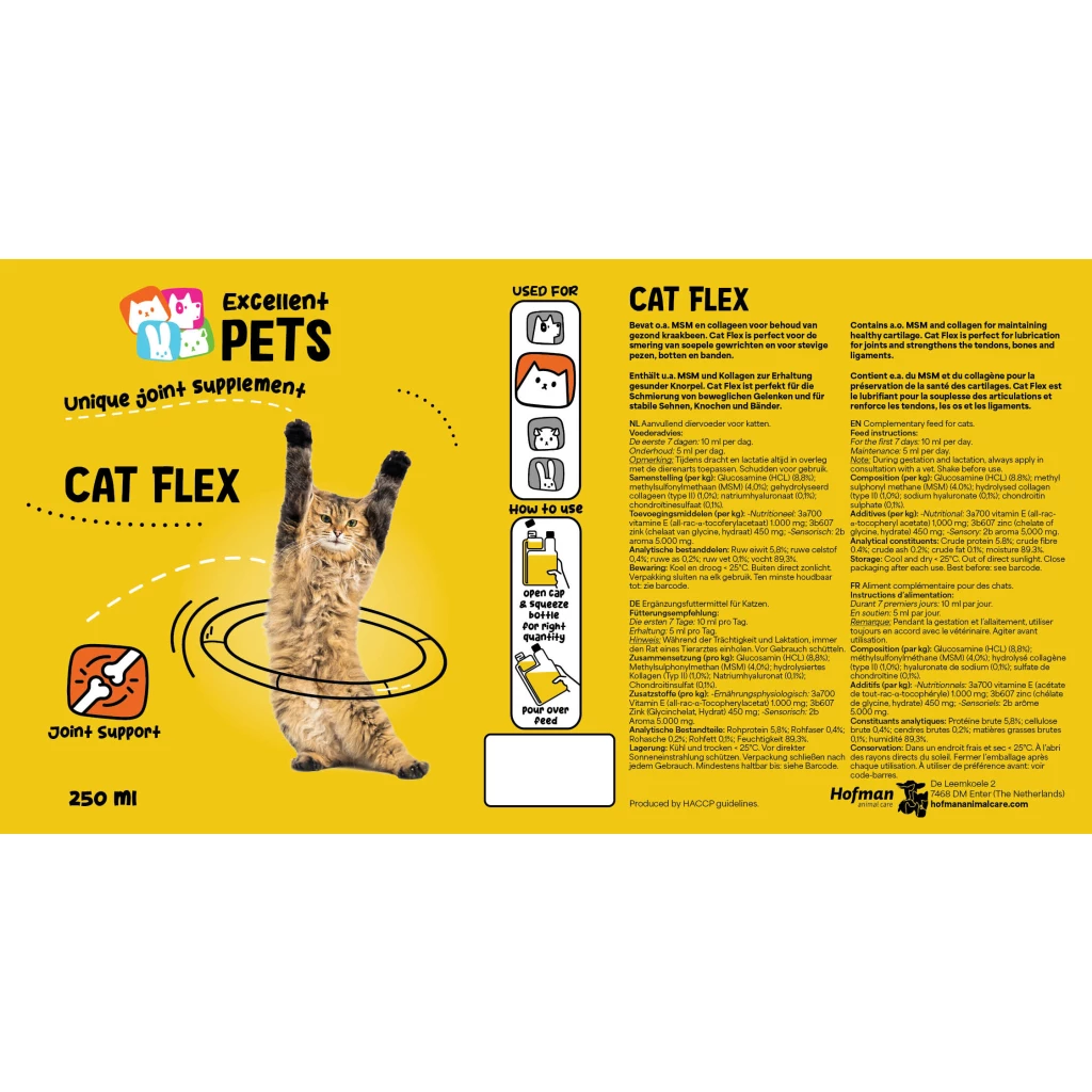 Excellent Pets Cat Flex ist ein Ergänzungsfuttermittel für Katzen in flüssiger Form. Es trägt zu geschmeidigen Gelenken und festen Knochen, Sehnen und Bändern bei.