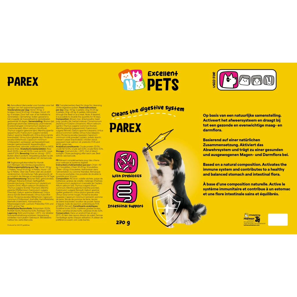 EffektExcellent Pets Dog Parex enthält u.a. eine Kräutermischung aus Ceylon-Zimt, Knoblauch, Thymian, Pfefferminze, Fenchel, Cleaver, Große Brennnessel, Ulme, Bitterholz und Chilipulver. Diese Mischung hilft bei der Reinigung des Verdauungssystems, aktiviert das Immunsystem und trägt zu einem glänzenden Fell bei. Darüber hinaus enthält sie Präbiotika in Form von FOS und MOS. FOS (Fructo-Oligosaccharide) und MOS (Mannan-Oligosaccharide) sind präbiotische Fasern, die zum Wachstum guter Darmbakterien beitragen, was für die Aufrechterhaltung eines gesunden Verdauungssystems von Vorteil ist. Geflügelfett und Lachsöl sorgen für einen leckeren Geschmack.