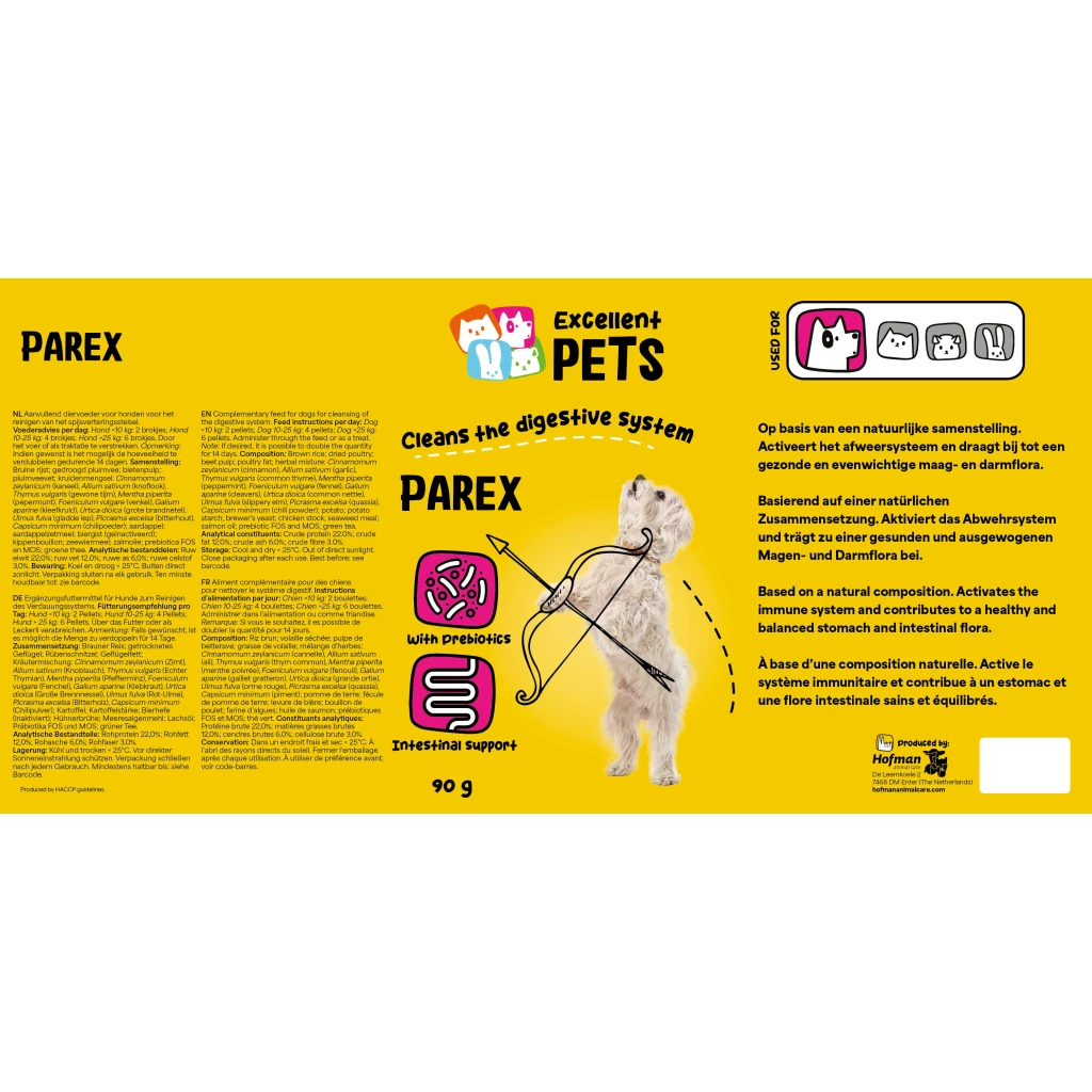Excellent Pets Dog Parex ist ein Ergänzungsfuttermittel für Hunde in Form von Kroketten. Es aktiviert das Immunsystem und trägt zu einer gesunden und ausgewogenen Magen-Darm-Flora bei.