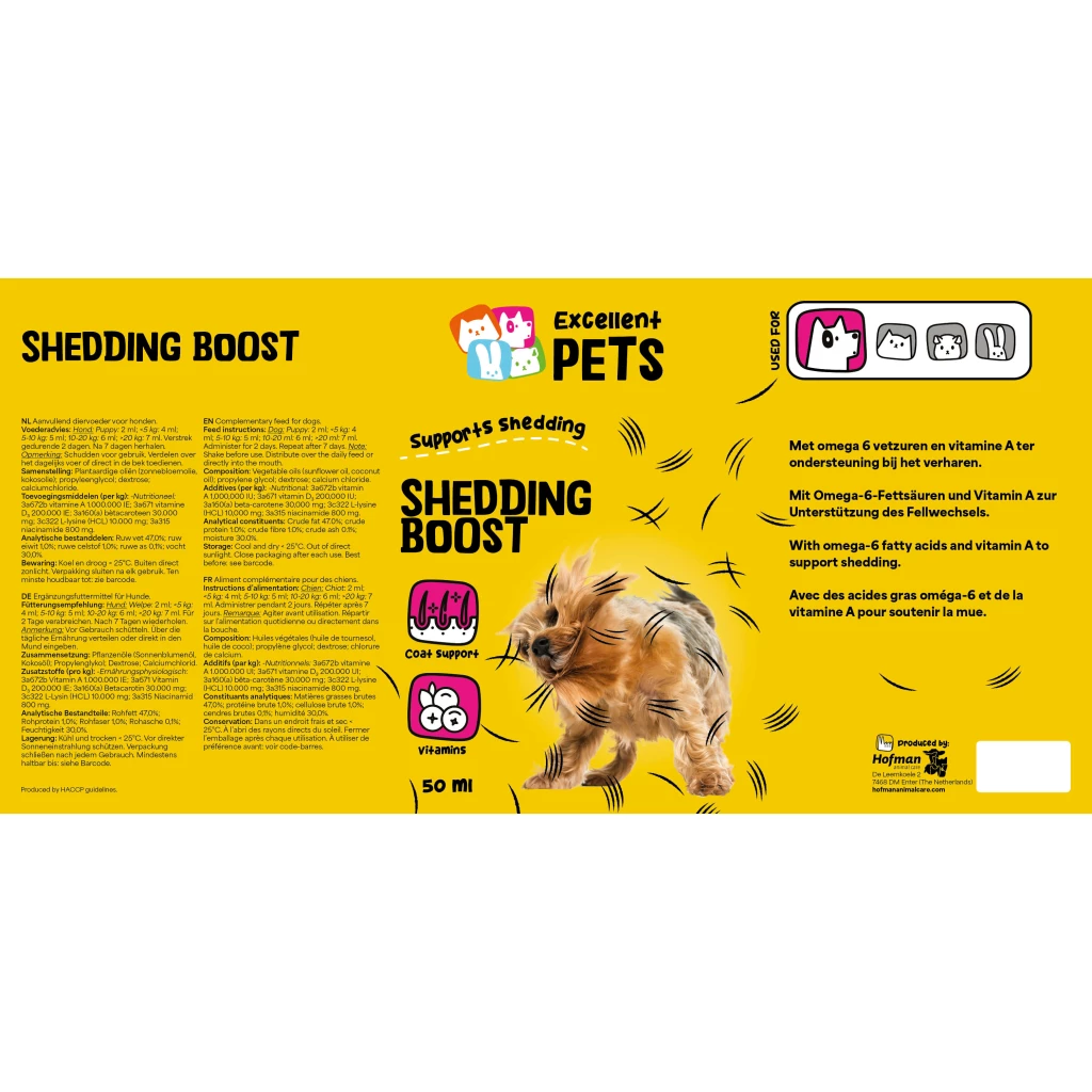 EffektExcellent Pets Shedding Boost enthält pflanzliche Öle (Sonnenblumenöl und Kokosnussöl) und Vitamin A. Sonnenblumenöl ist reich an Omega-6-Fettsäuren, die die Erhaltung einer gesunden Haut unterstützen. Kokosnussöl ist reich an mittelkettigen Fettsäuren (MCTs), die eine schnell verfügbare Energiequelle darstellen. Vitamin A ist wichtig für die Erhaltung einer gesunden Haut. Diese Kombination von Inhaltsstoffen hilft, den Fellwechsel zu beschleunigen.