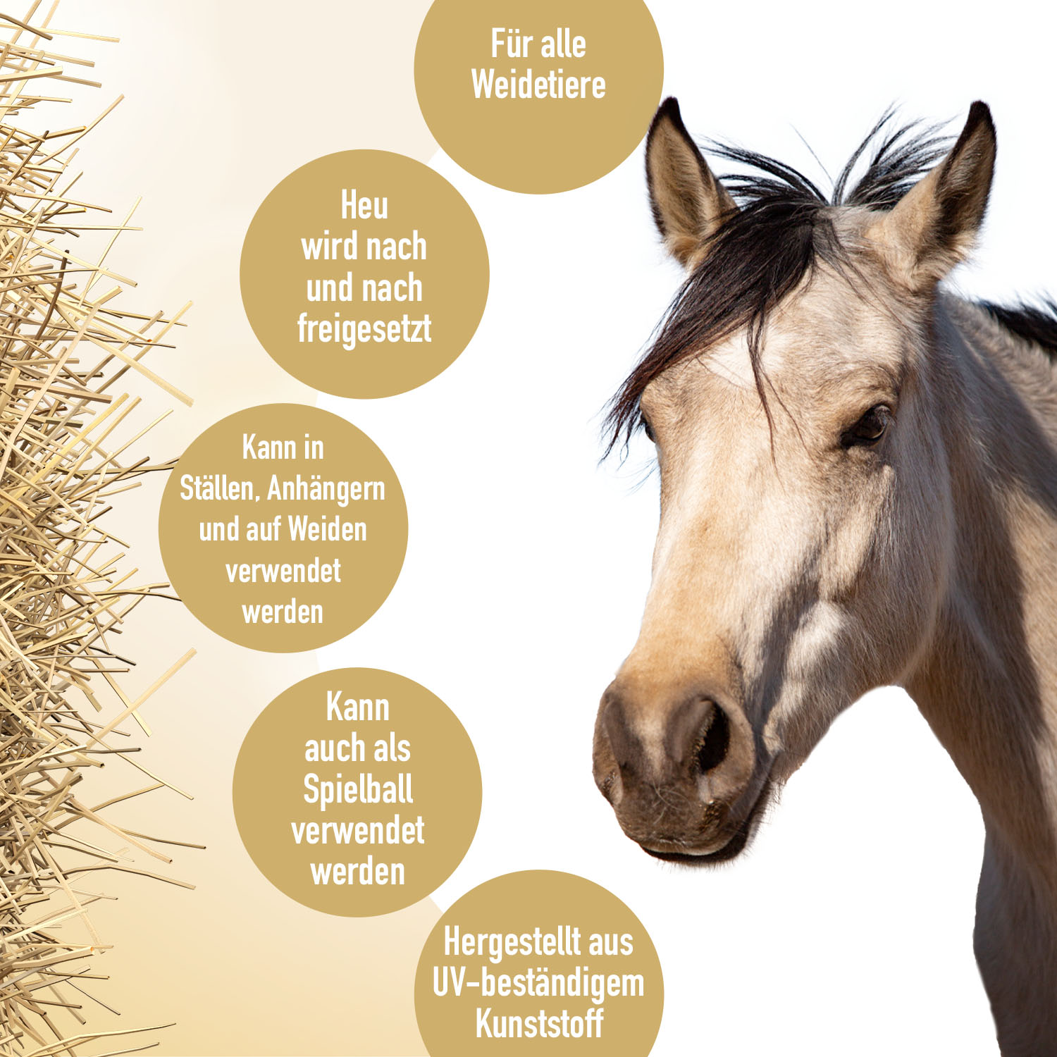 Der Hay Slow Feeder eignet sich für den Einsatz im Trailer, Stall oder Weide. Sie können den Ball mit Karotten, Apfelstücken, Stroh, Gras oder Kräutern füllen, für stundenlanges Spielvergnügen Ihres Pferdes.